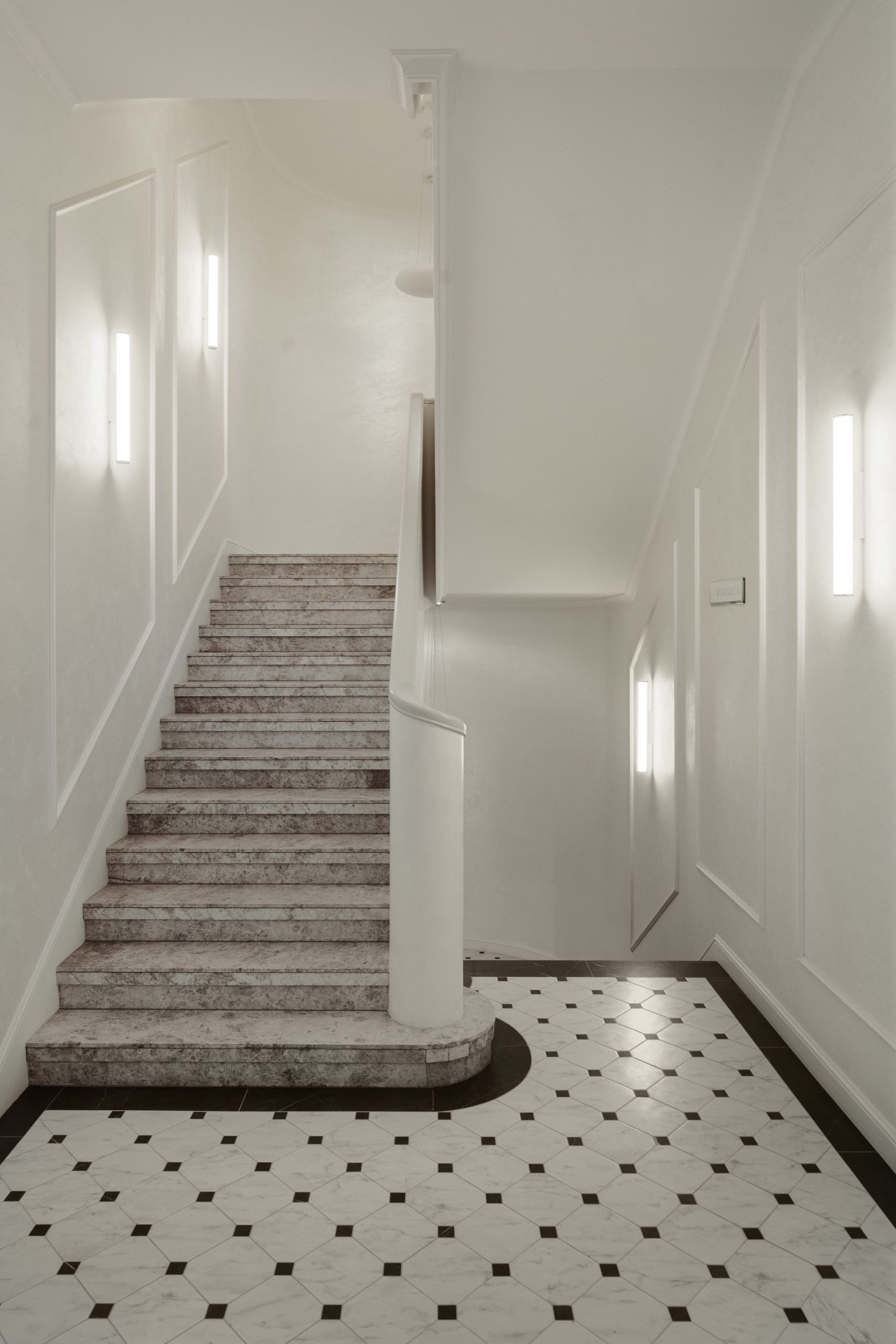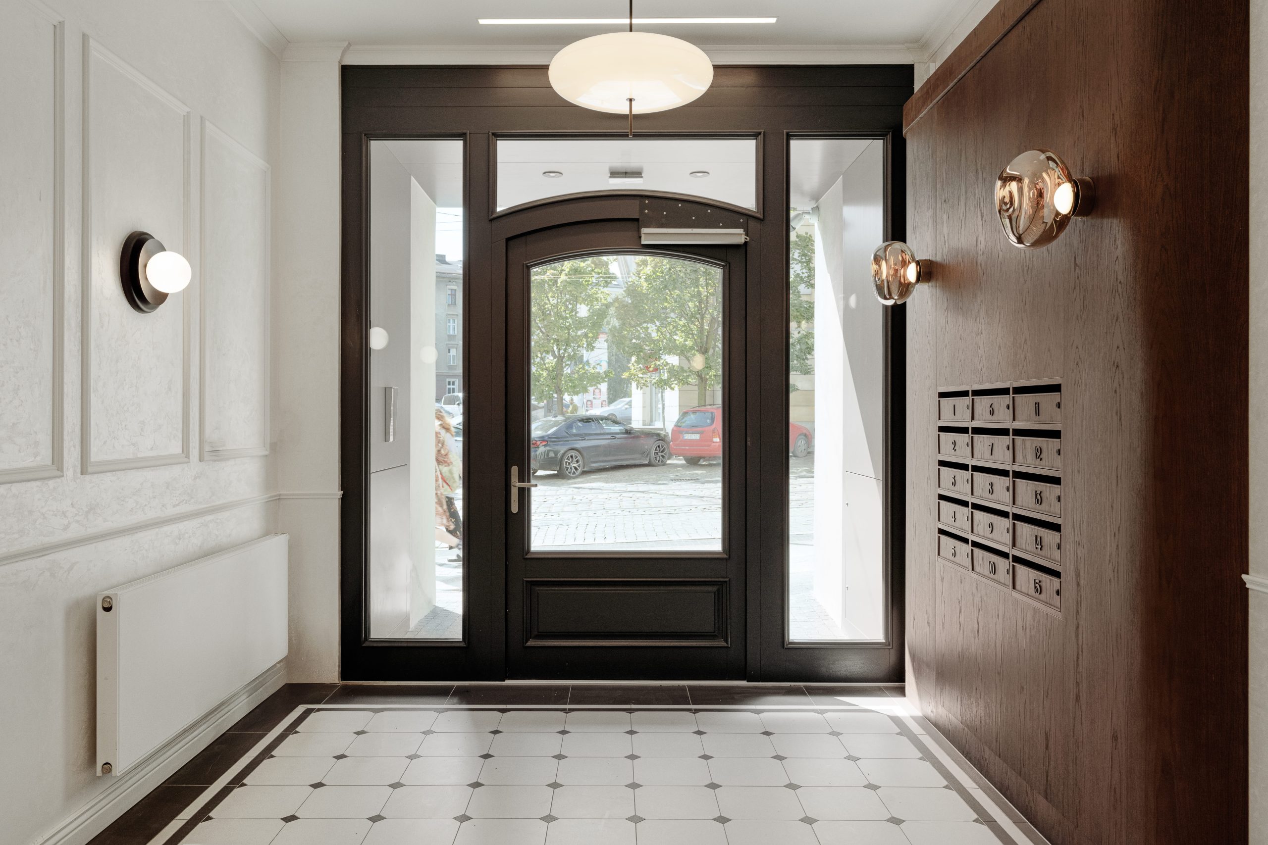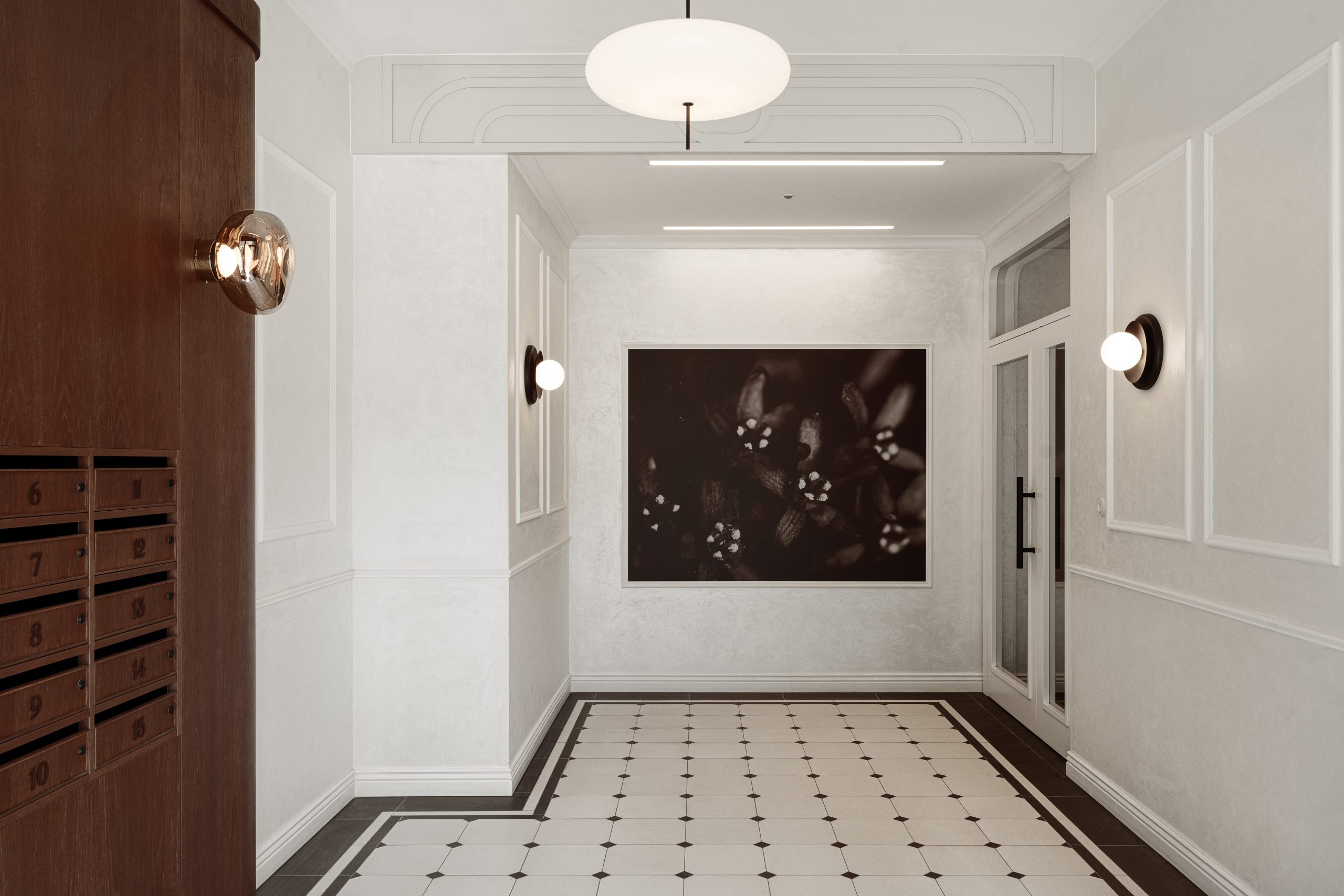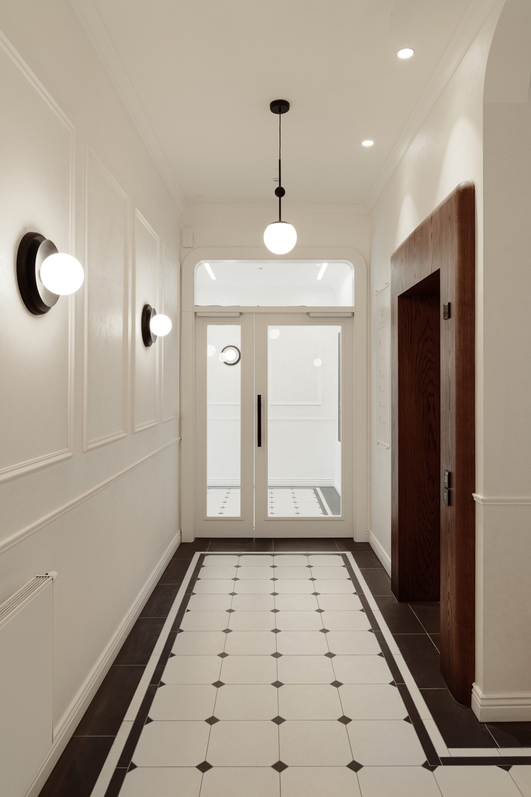 We wnętrzach pojawiają się subtelne nawiązania do secesyjnej ornamentyki i linii, zestawione z nowoczesnym oświetleniem i detalami. Takie połączenie pozwoliło zachować historyczną tożsamość kamienic, nadając im jednocześnie świeżość i aktualny wyraz.