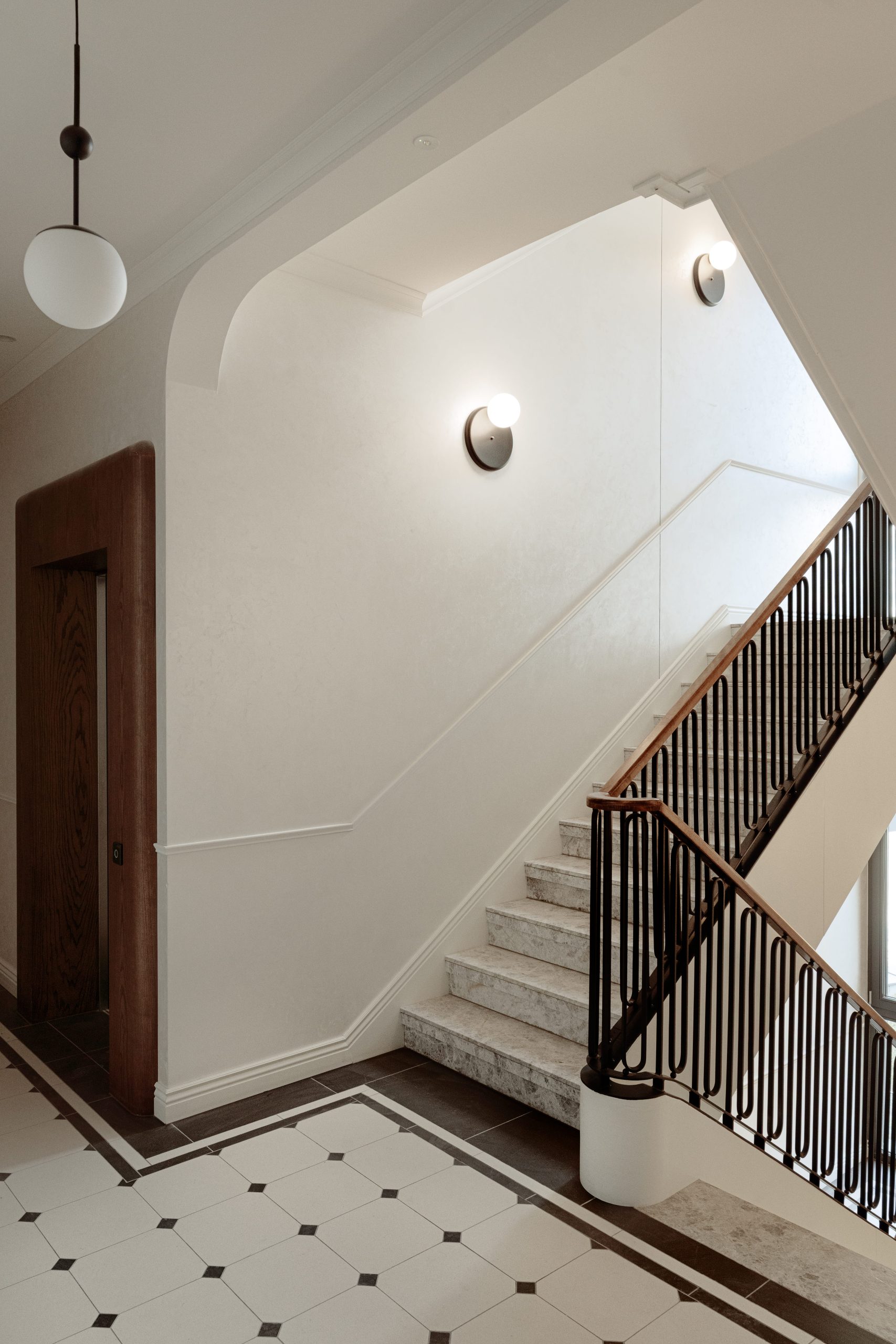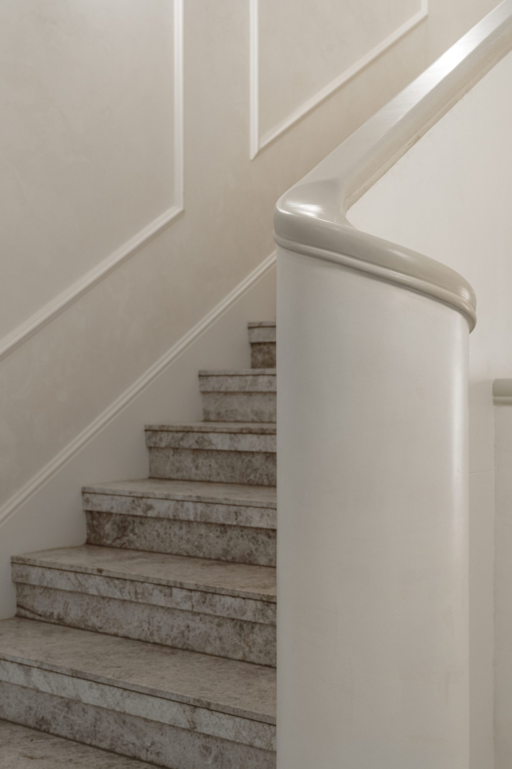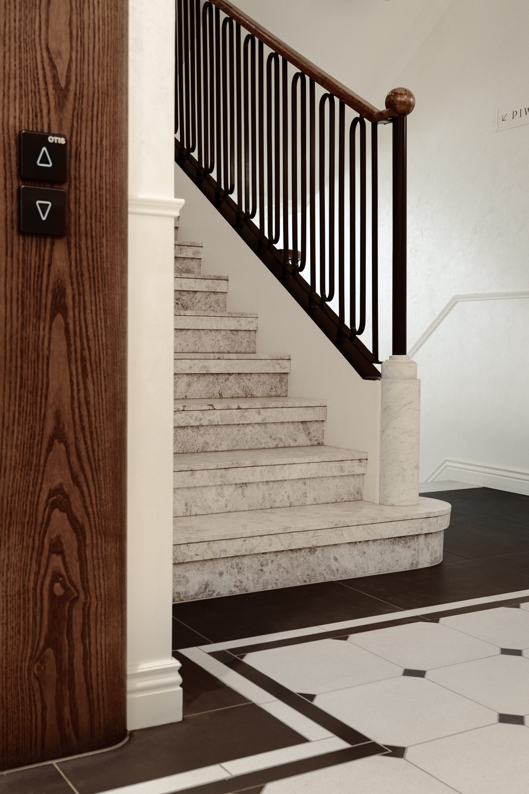 Przestrzenie wspólne stanowią reprezentacyjną część obiektu i mają kluczowy wpływ na odbiór całego budynku. To właśnie hol wejściowy i klatka schodowa budują pierwsze wrażenie oraz definiują standard i charakter inwestycji. Projekt koncentrował się więc na stworzeniu spójnej, eleganckiej narracji przestrzennej, która podkreśla prestiż miejsca i jego historyczny kontekst.