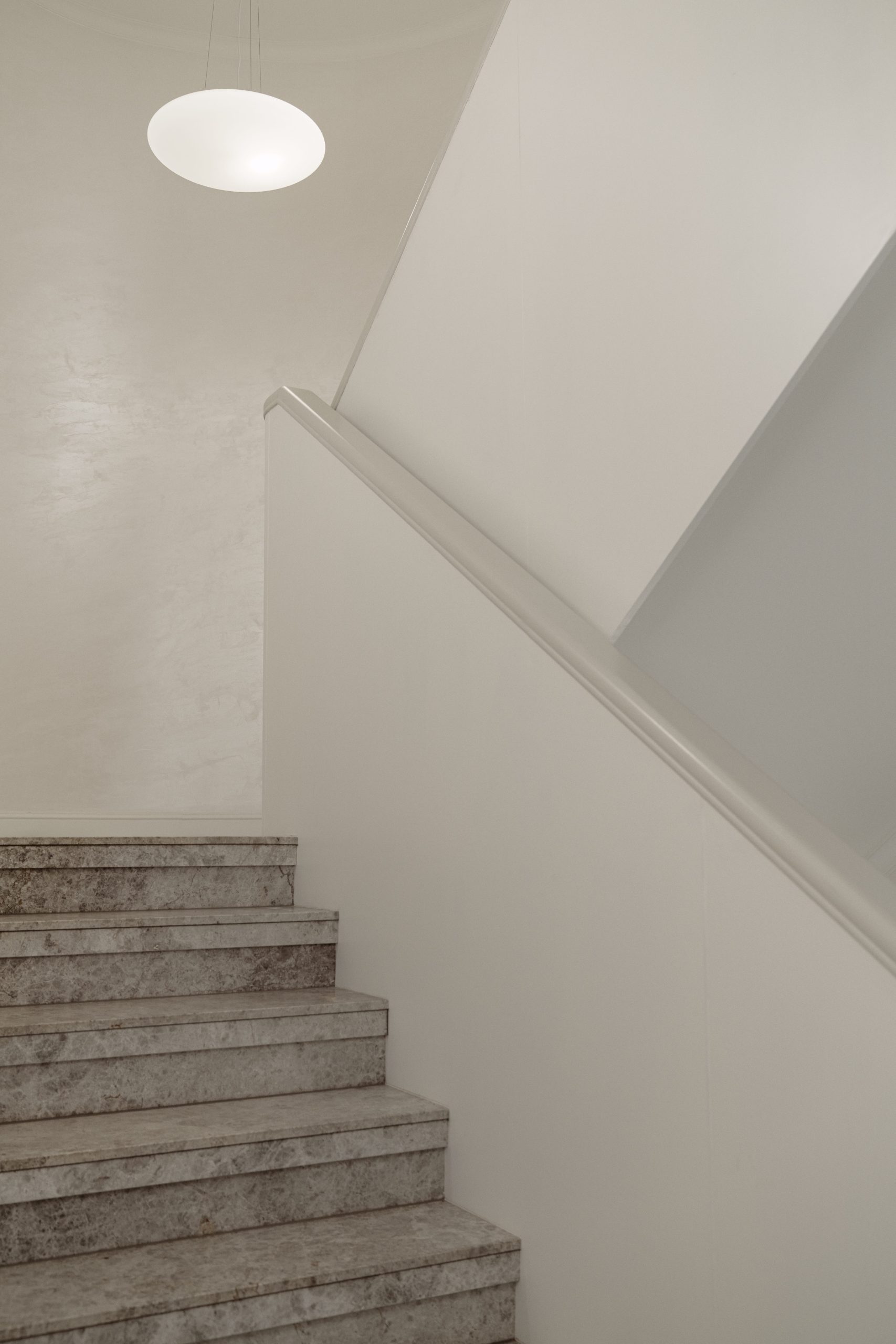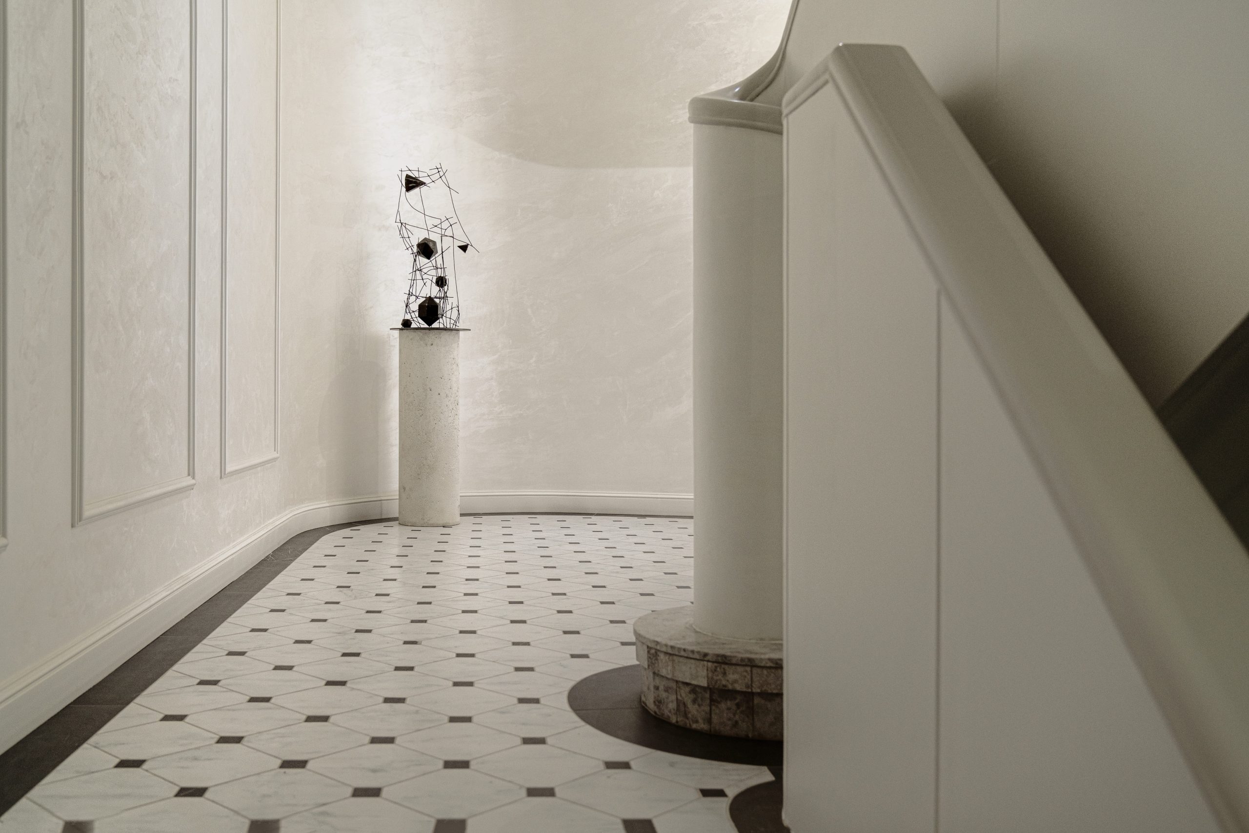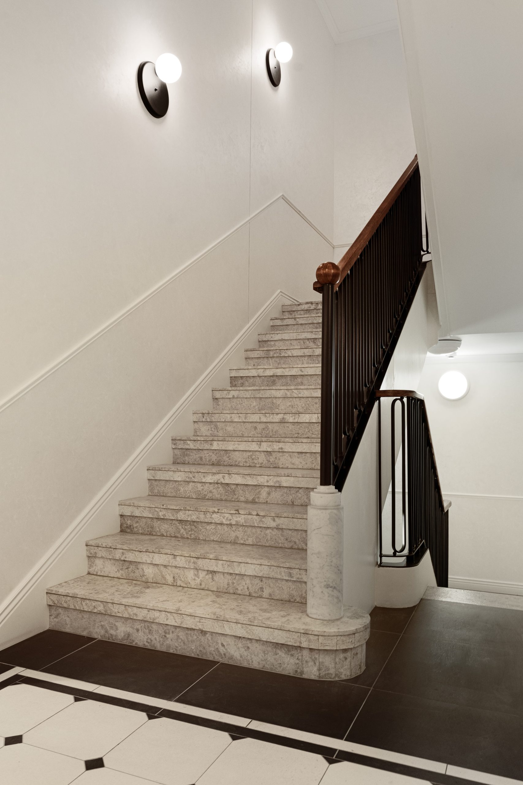 Przestrzenie wspólne stanowią reprezentacyjną część obiektu i mają kluczowy wpływ na odbiór całego budynku. To właśnie hol wejściowy i klatka schodowa budują pierwsze wrażenie oraz definiują standard i charakter inwestycji. Projekt koncentrował się więc na stworzeniu spójnej, eleganckiej narracji przestrzennej, która podkreśla prestiż miejsca i jego historyczny kontekst.