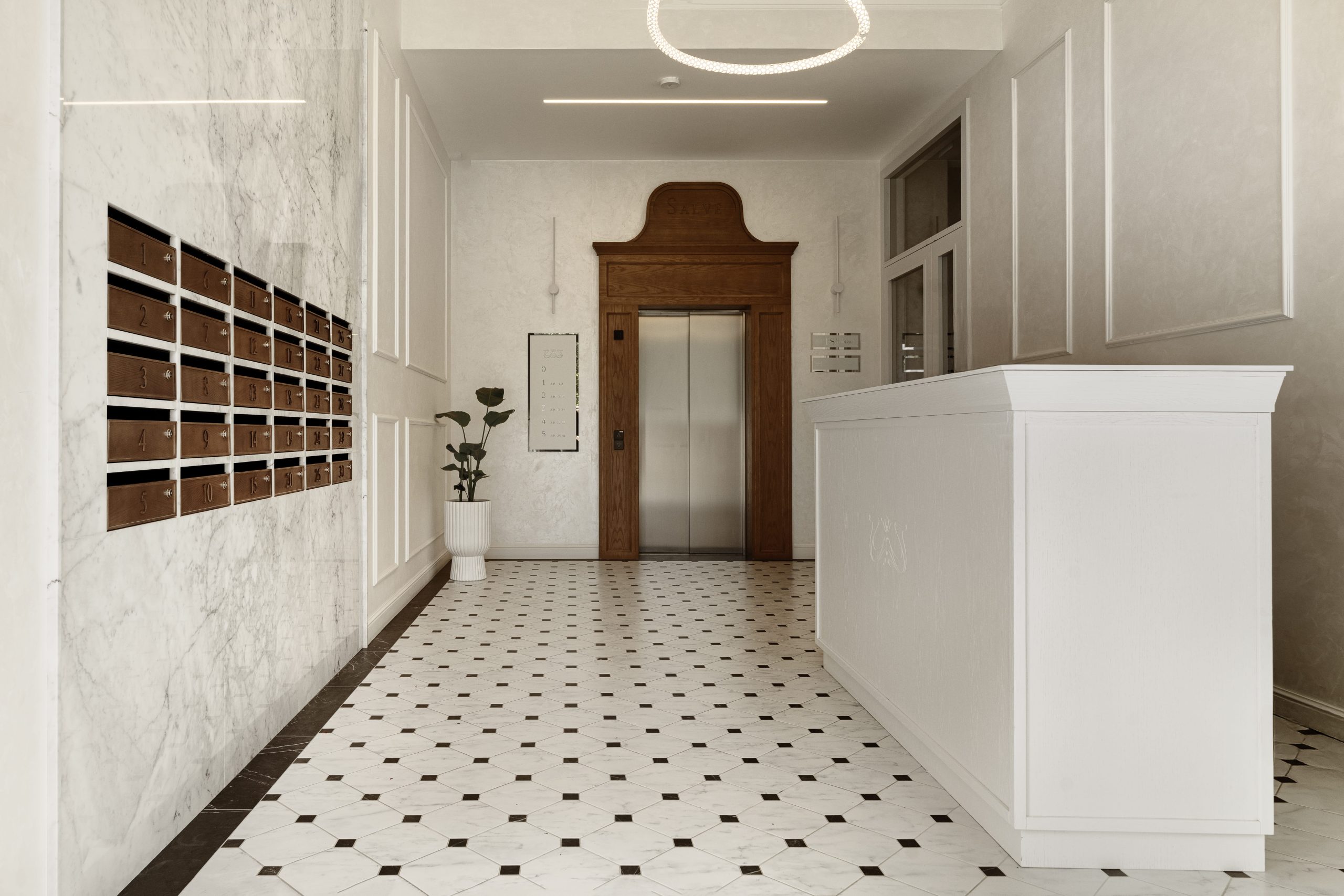 Nasze doświadczenie obejmuje zarówno wnętrza mieszkalne, jak i przestrzenie publiczne, w tym klatki schodowe, hole wejściowe lub bar, jak na załączonych fotografiach. Dzięki temu nasze projekty wnętrz łączą elegancję przeszłości z funkcjonalnością współczesnych przestrzeni.