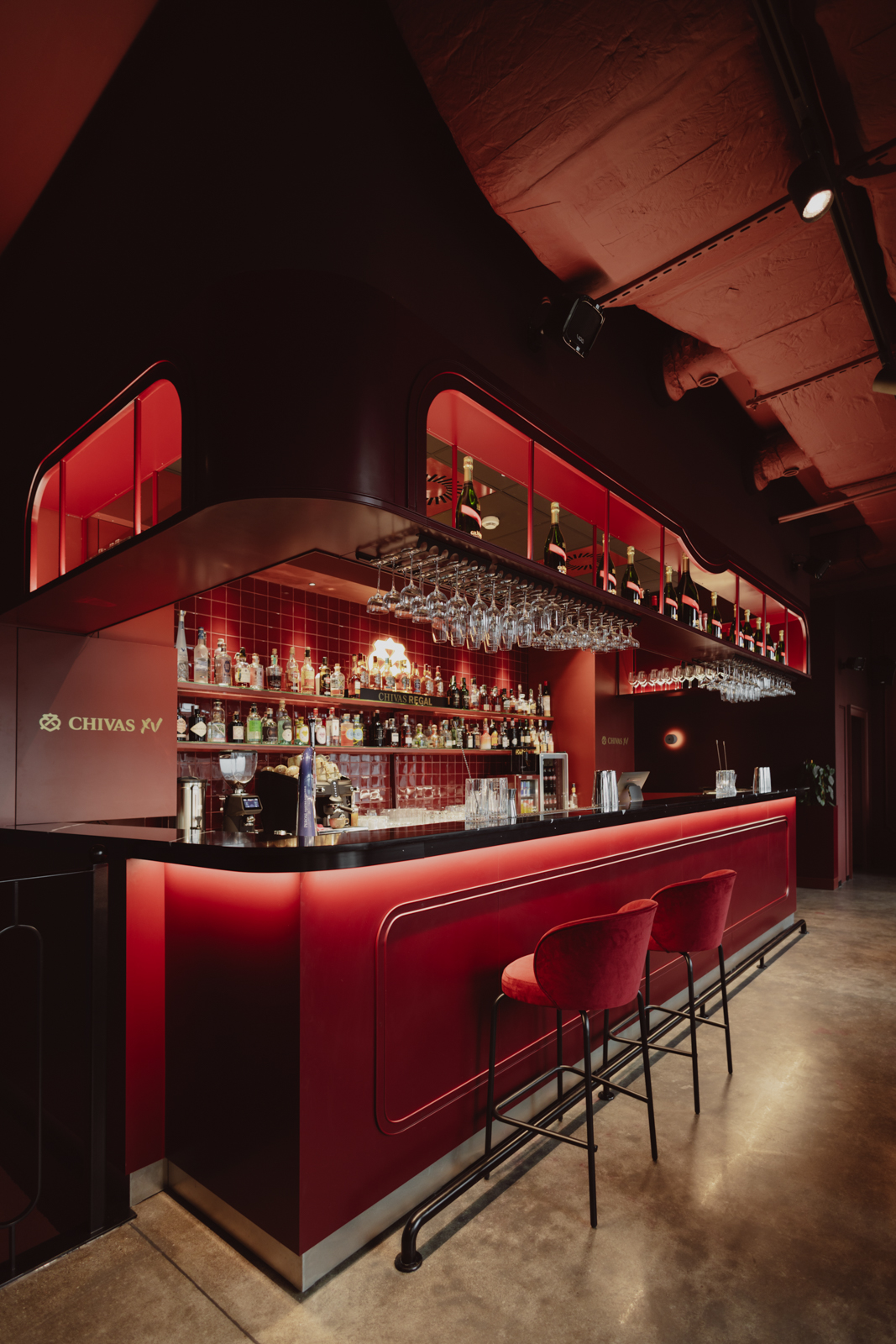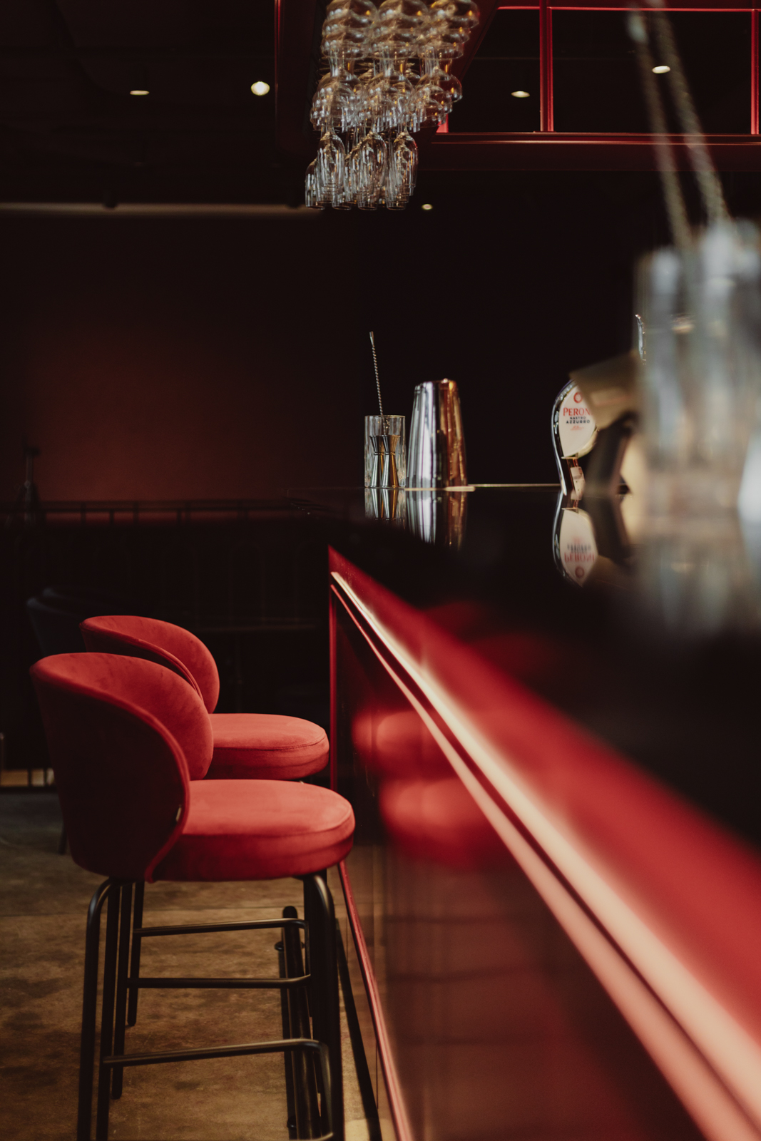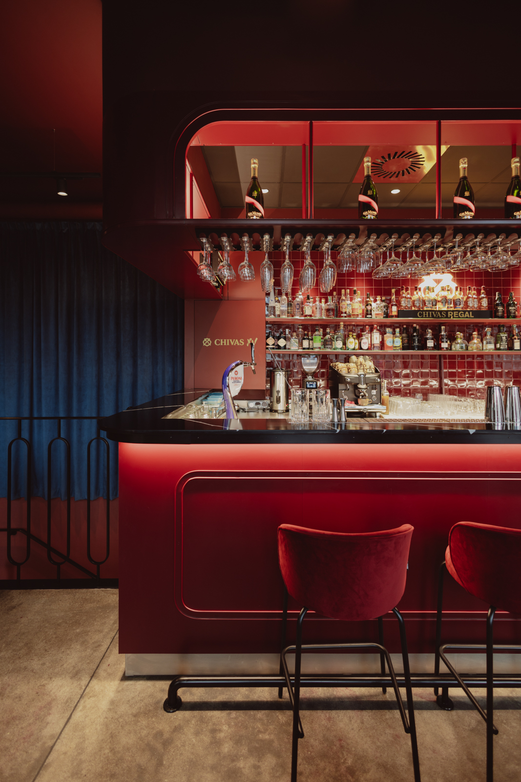 Miękkie, welurowe tkaniny stanowią kontrapunkt dla zdecydowanej, stalowej formy baru w odcieniu burgundu. Jego geometryczna, wyrazista bryła porządkuje układ funkcjonalny oraz wyznacza oś kompozycyjną wnętrza, stając się centralnym elementem organizującym przestrzeń.
