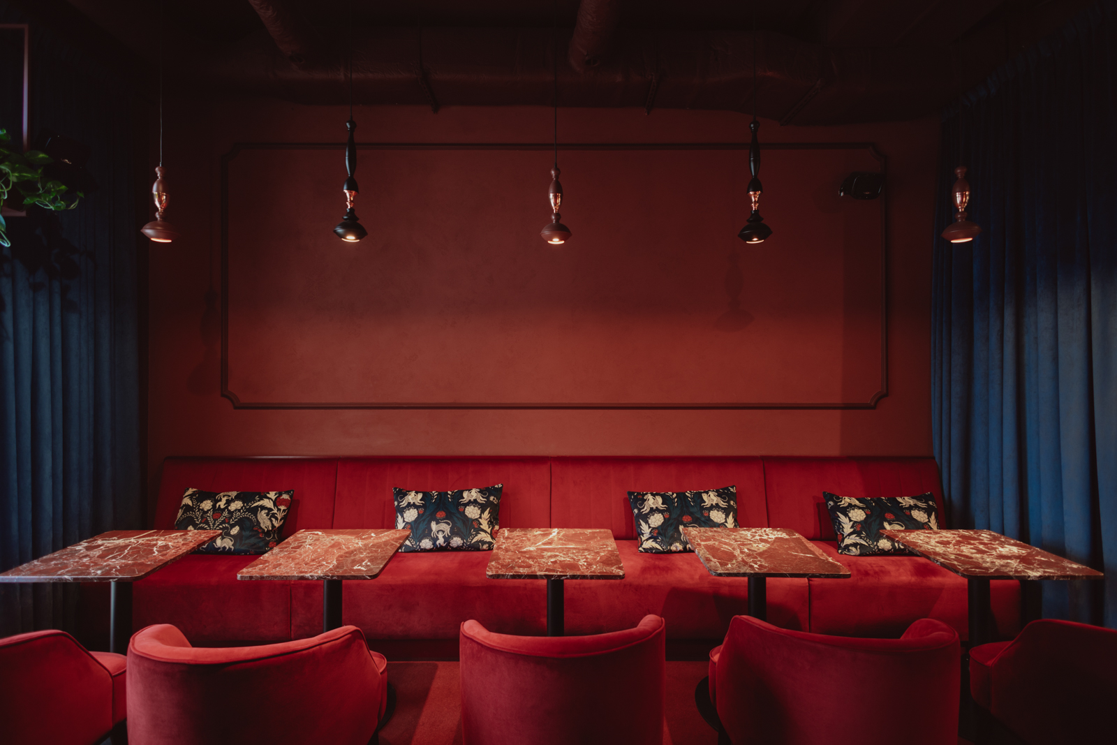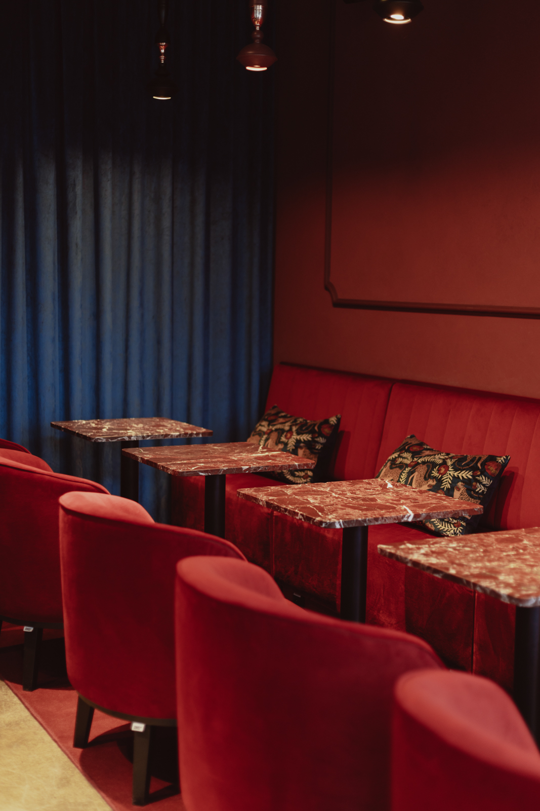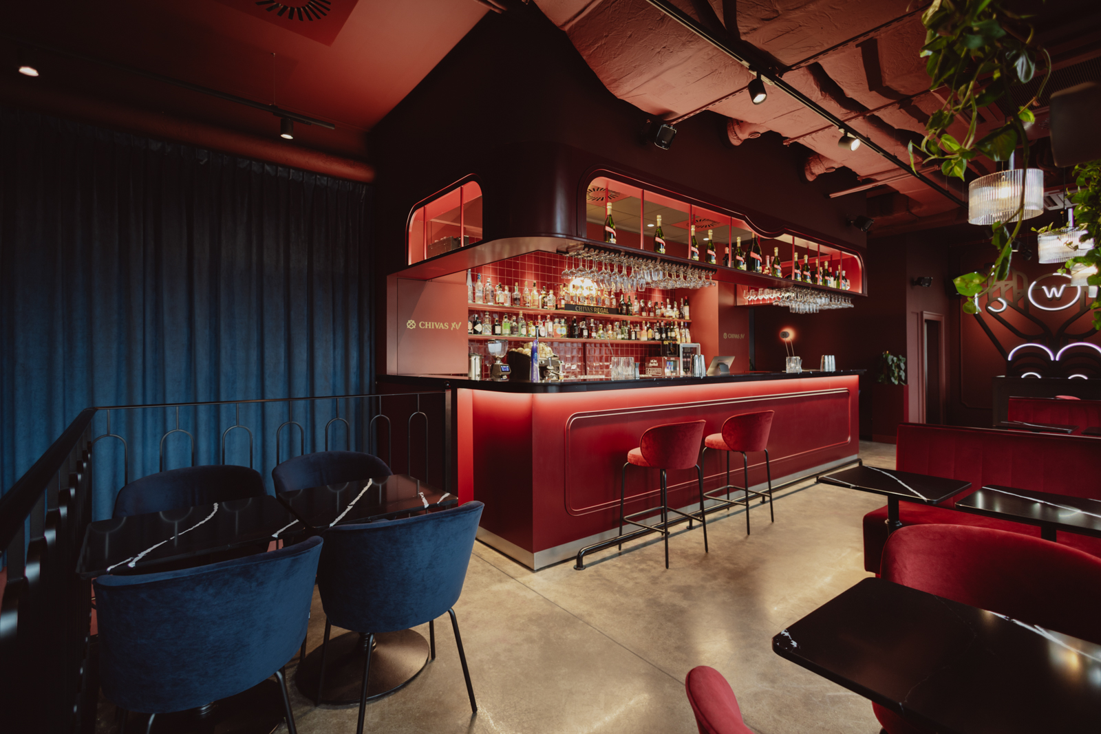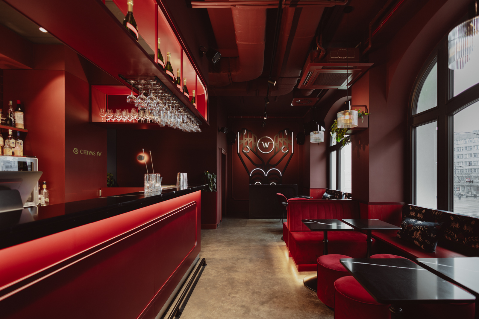 Projekt wnętrz został oparty na precyzyjnie zdefiniowanej relacji światła, koloru i materii. Głęboka paleta burgundu i granatu buduje wyrazistą tożsamość przestrzeni, nadając jej elegancki, nasycony charakter. Subtelnie modelowane oświetlenie akcentuje strukturę materiałów i podkreśla wielowarstwowość kompozycji.