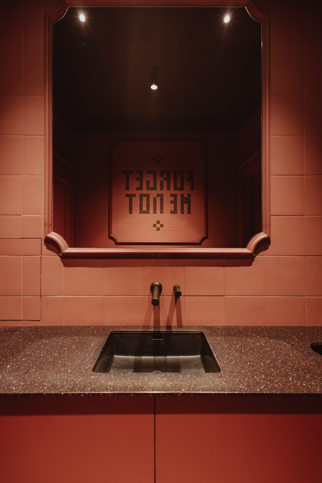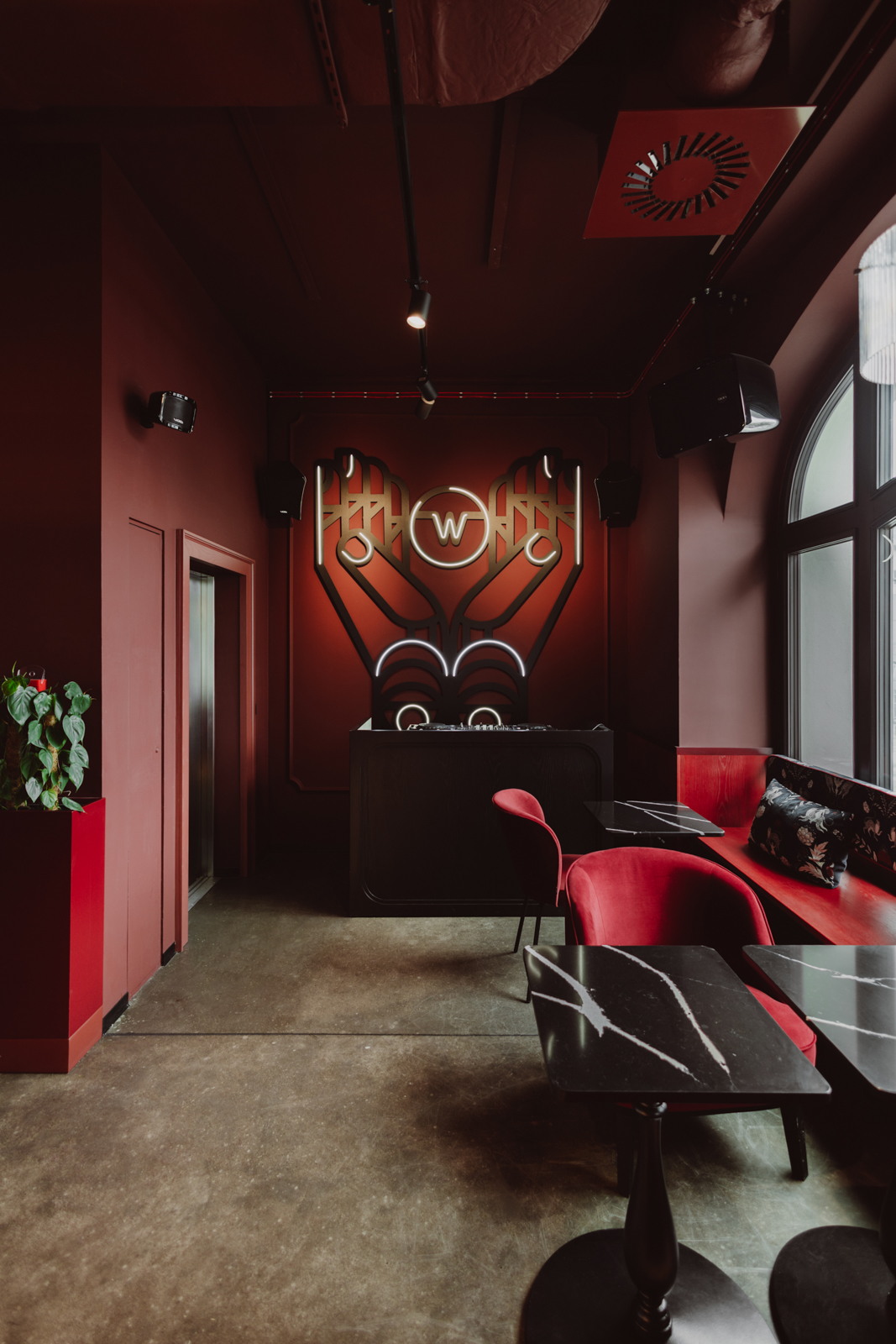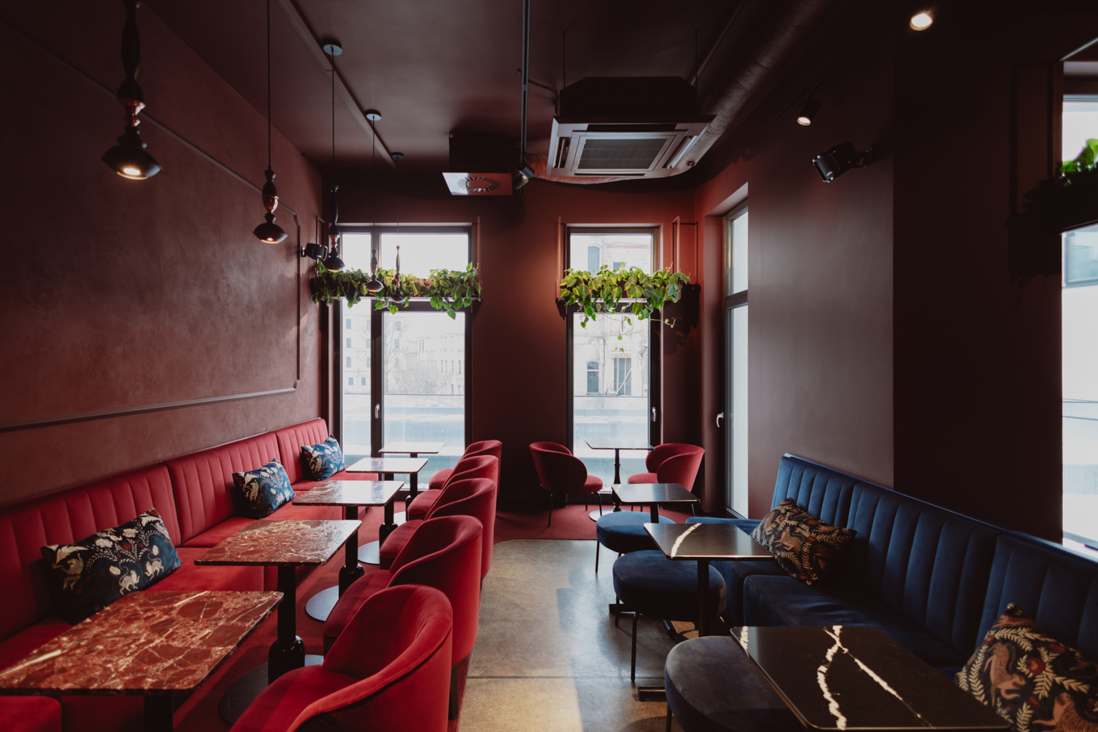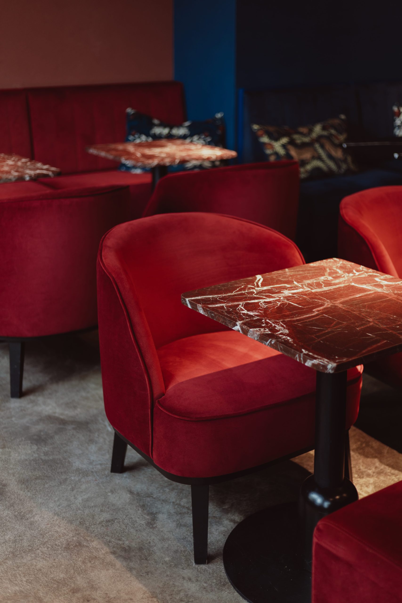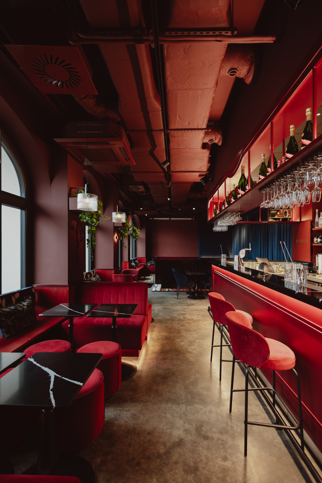 Projekt wnętrz został oparty na precyzyjnie zdefiniowanej relacji światła, koloru i materii. Głęboka paleta burgundu i granatu buduje wyrazistą tożsamość przestrzeni, nadając jej elegancki, nasycony charakter. Subtelnie modelowane oświetlenie akcentuje strukturę materiałów i podkreśla wielowarstwowość kompozycji.